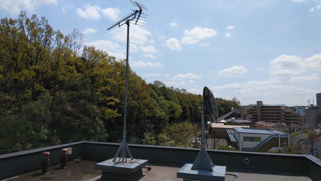- 現状:マンション屋上:UHFアンテナ(4mの高さで設置)、BSアンテナ工事、BS混合ブースター工事(直列接続)