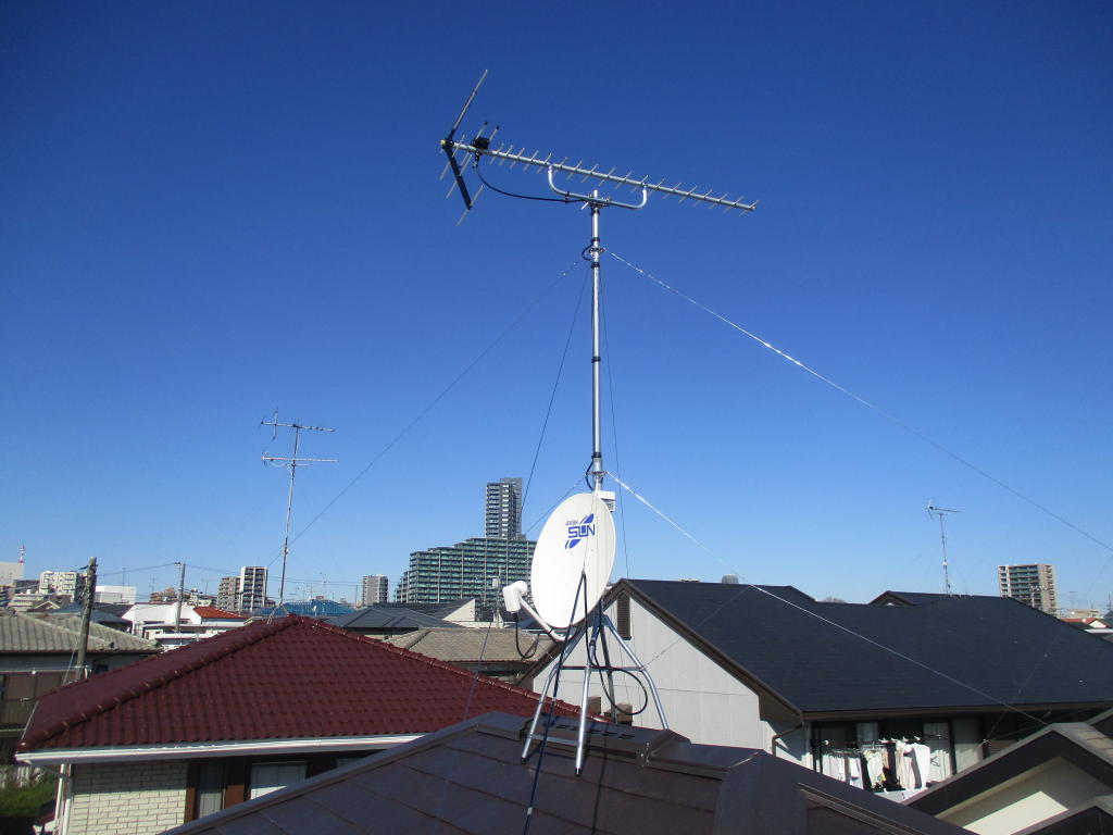 - BSアンテナが屋根上のアンテナと一緒に取り付けられる事は多いが、アンテナ支線4本で建てられると、BSアンテナ(中華鍋の様なもの)が強風で煽られ(台風なら傘すらさせない)アンテナが傾き、BSが映らなくなりアンテナ修理費用が掛かります(アンテナ修理になればアンテナ工事自体が2重負担)