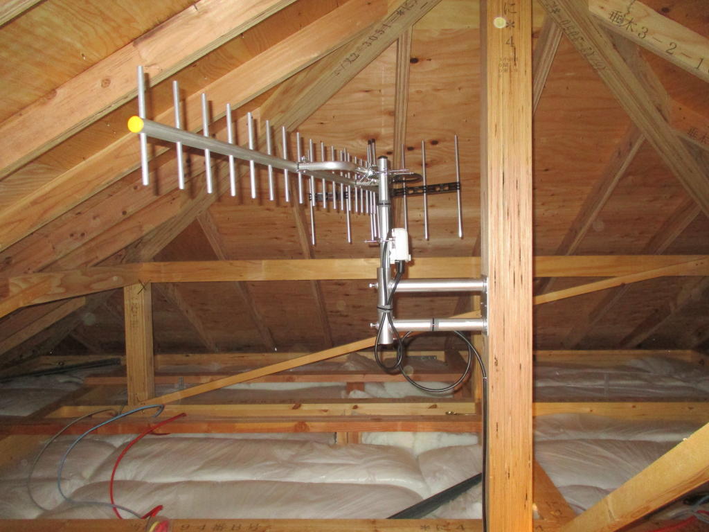 - お客様のご希望が多い屋根裏アンテナ工事は、地形的凹凸の背景で各電波塔からの電波受信環境に大きく左右はされますが、電波受信基準値を満たせば外観が一番スッキリして耐久性が一番良いアンテナ工事